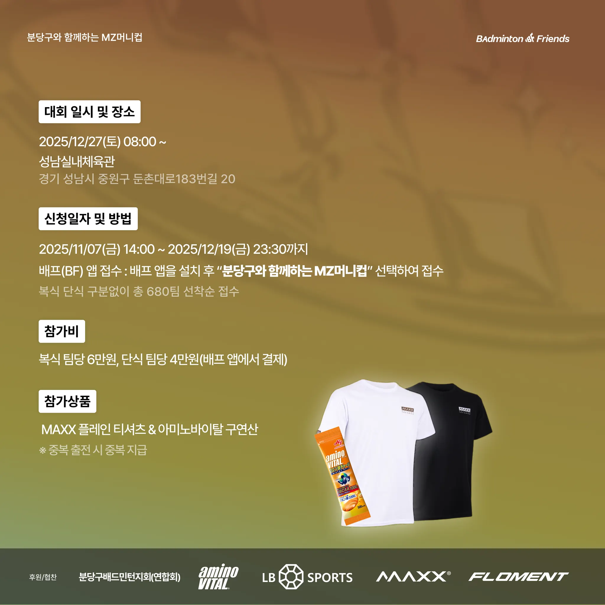 통합(남단,여단) | 15만원(팀당) | MAXX 최고급 라켓 1개(팀당) | 배프 양말 1개(팀당) |