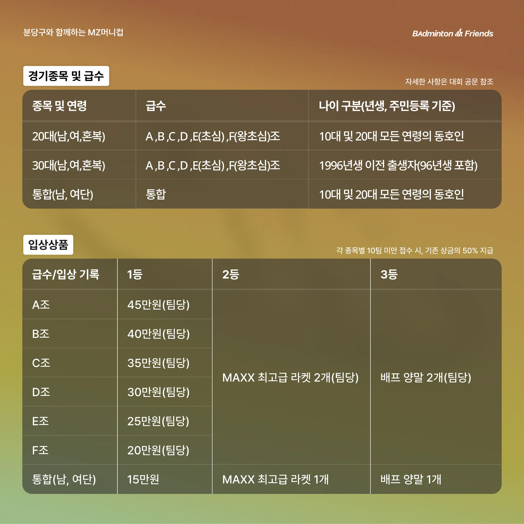 20대(남복,여복,혼복) | A조,B조,C조,D조,E조(초심),F조(왕초심) | 10대 및 20대 모든 연령의 동호인 |