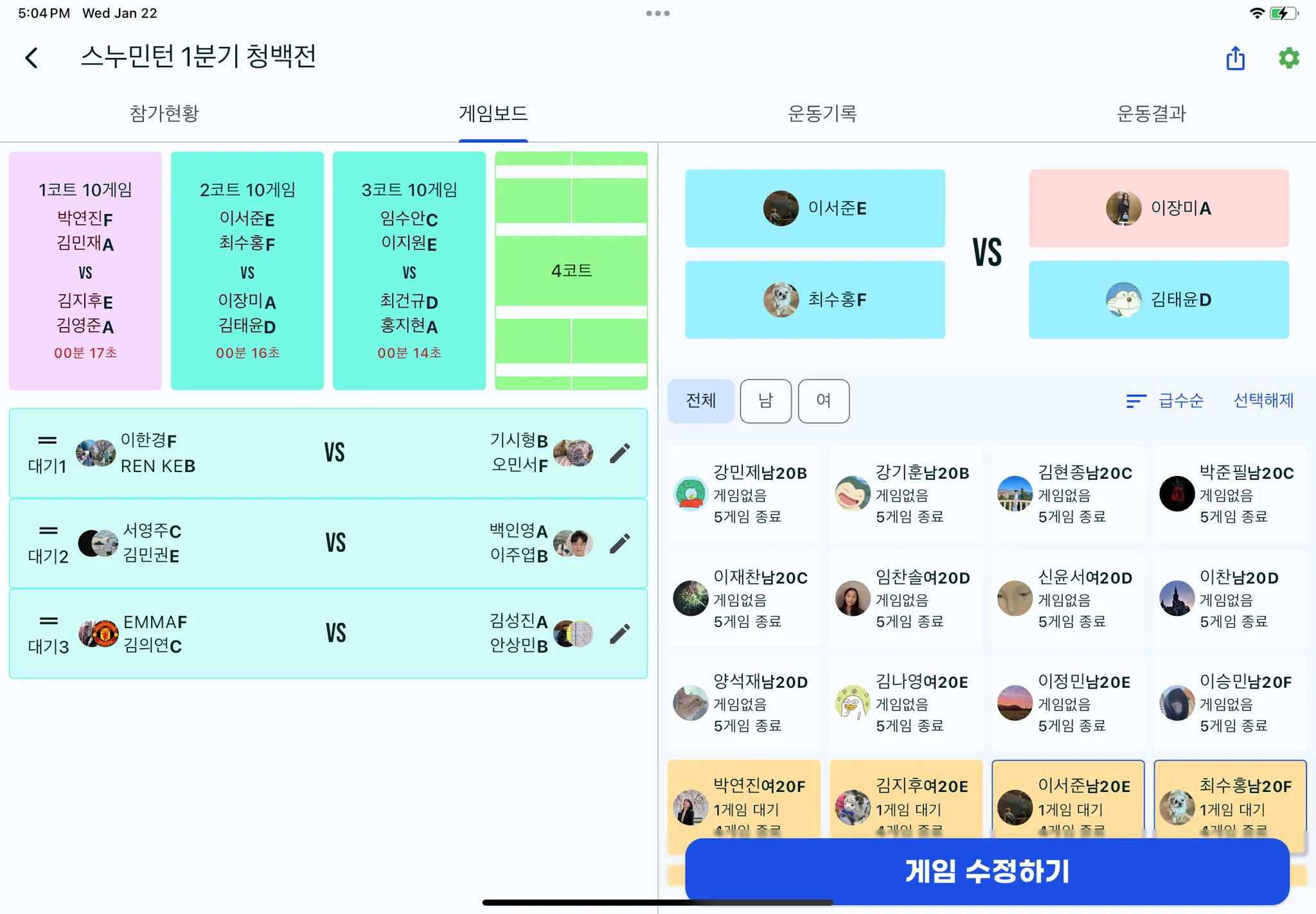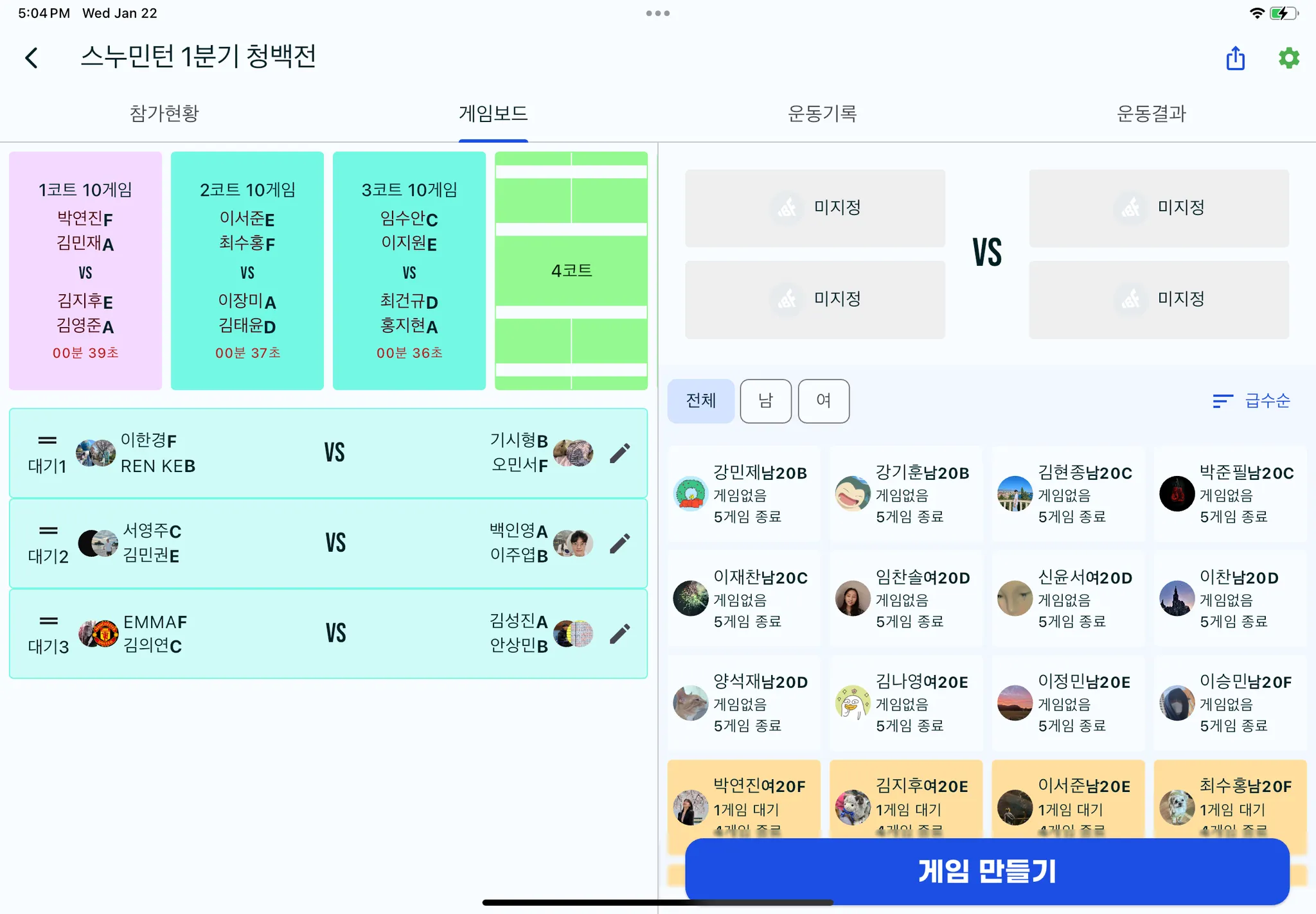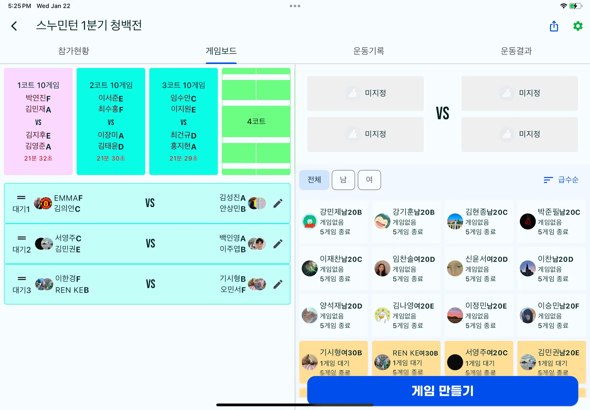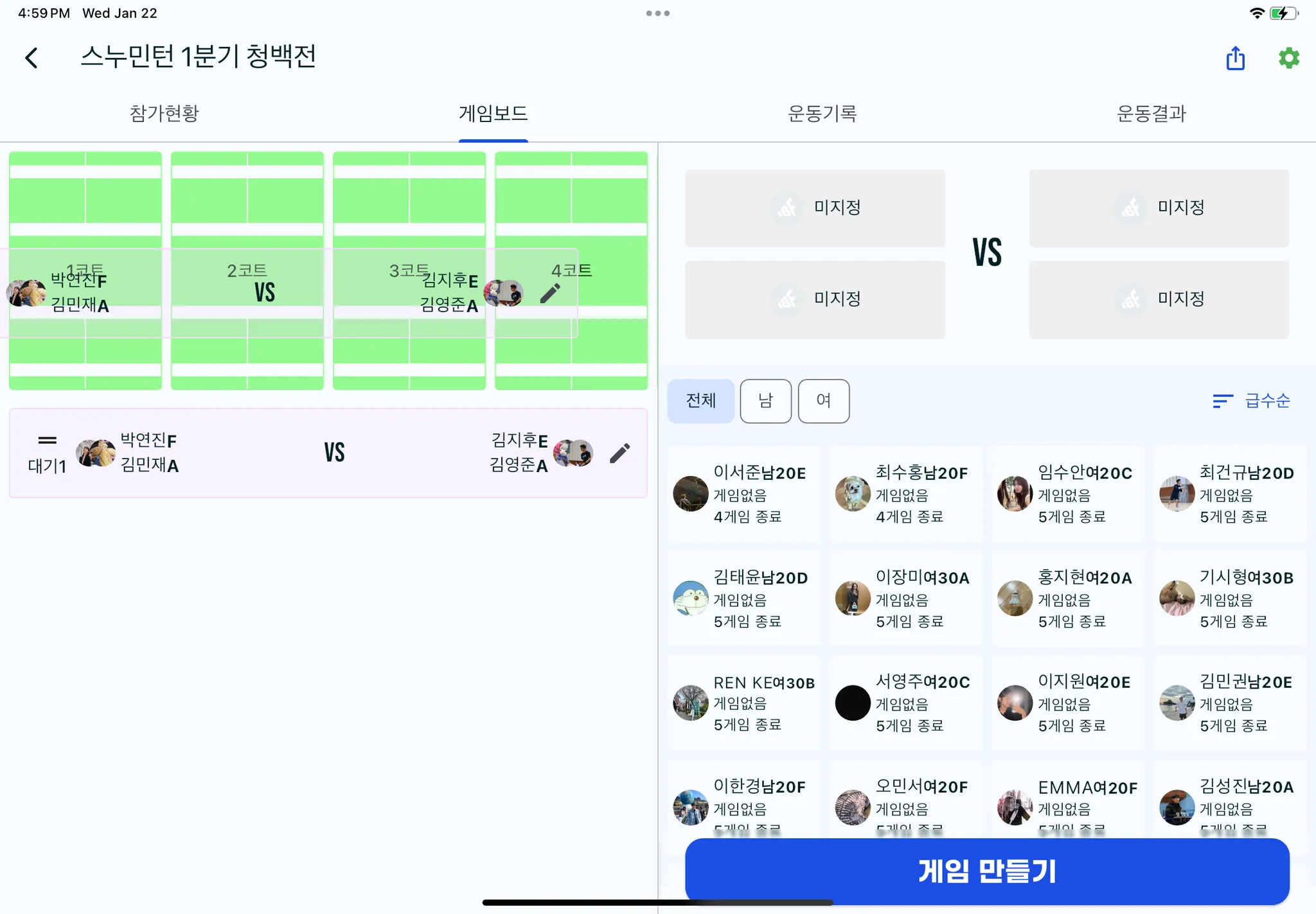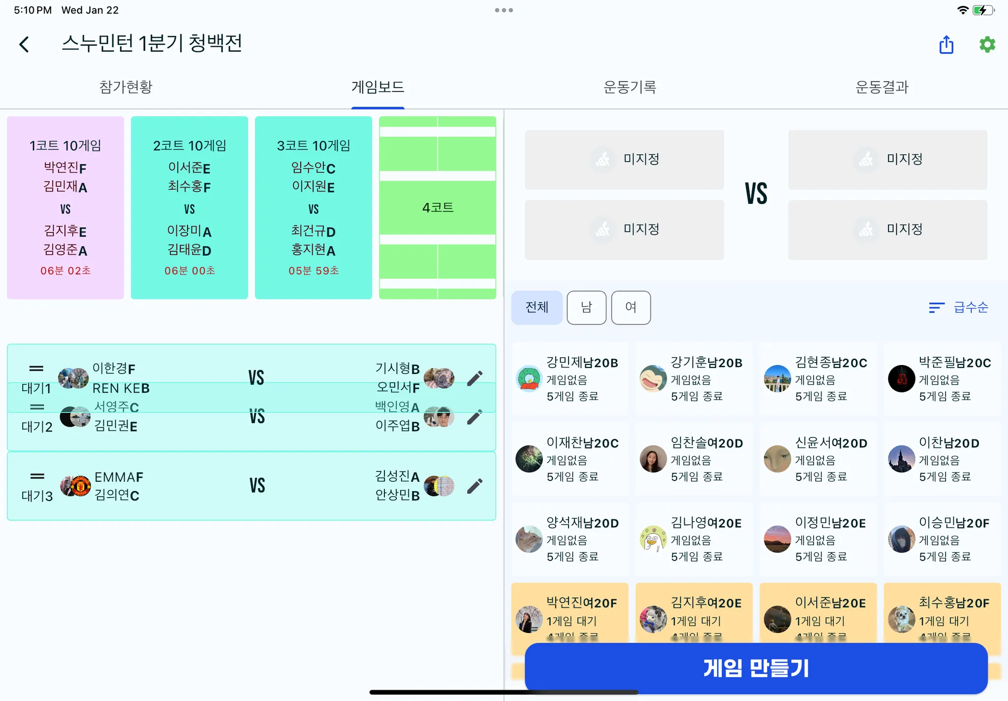 대기 목록의 게임을 길게 누른 후 원하는 코트로 드래그하면 게임이 배정됩니다