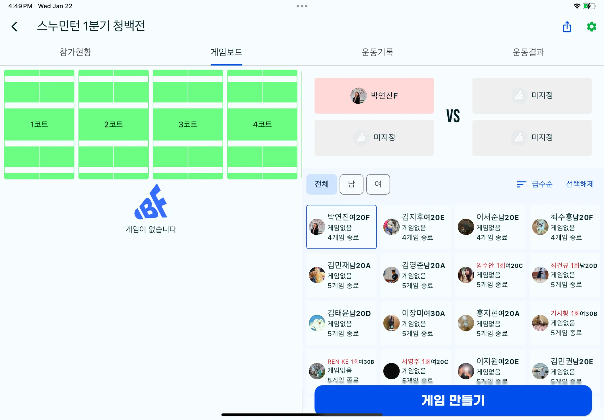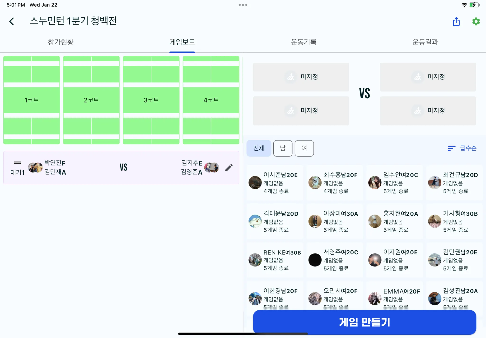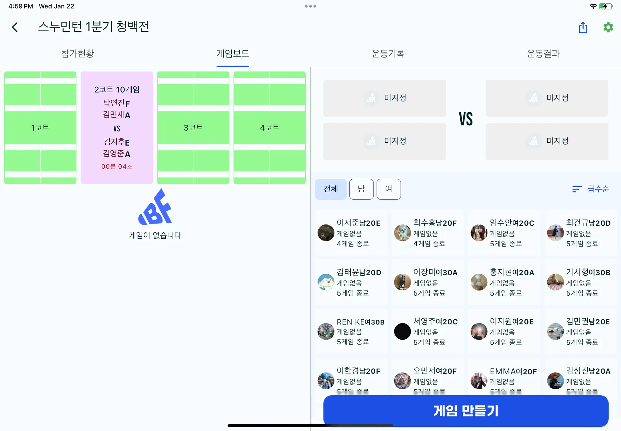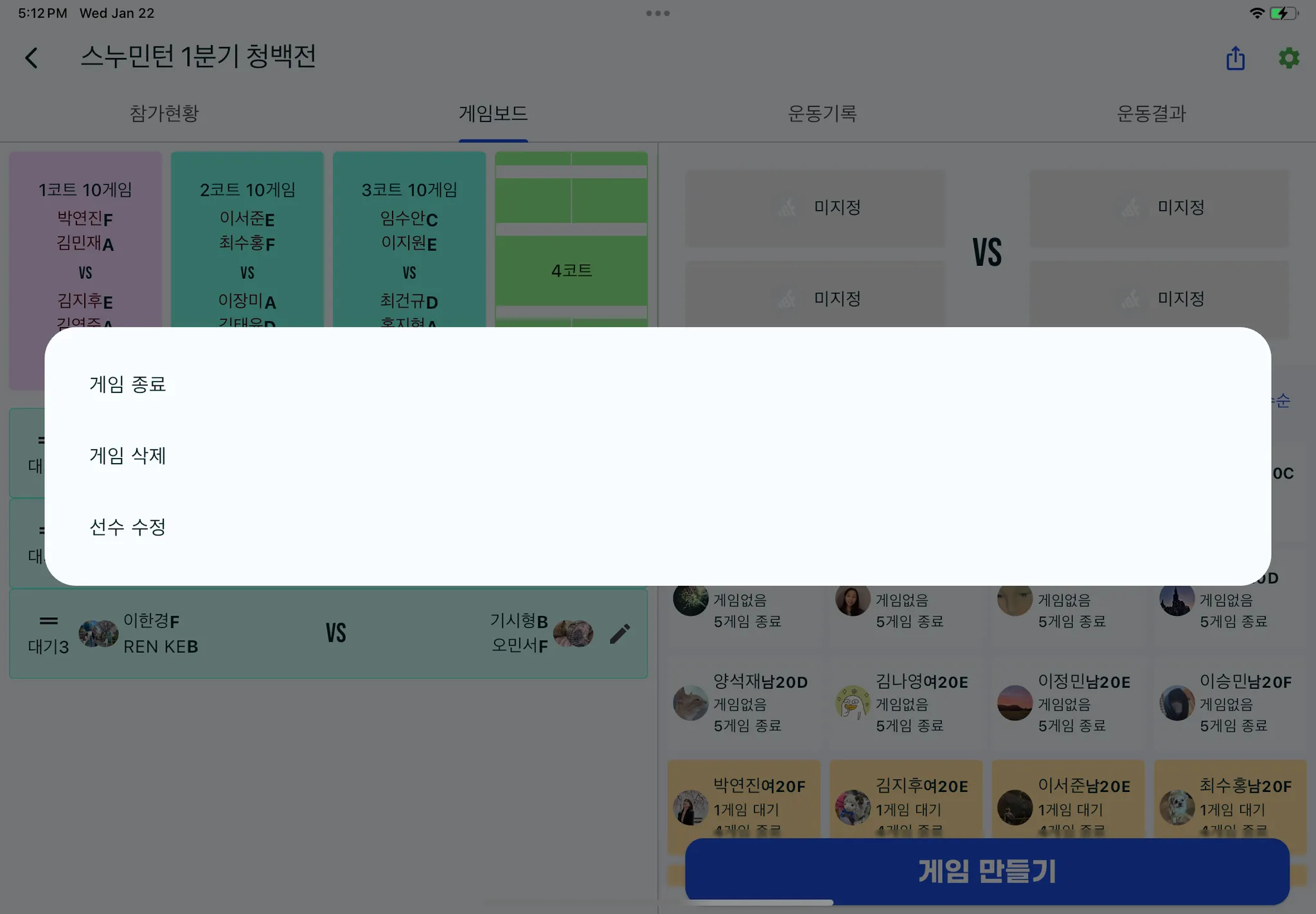 대기 목록의 게임을 길게 누른 후 원하는 코트로 드래그하면 게임이 배정됩니다