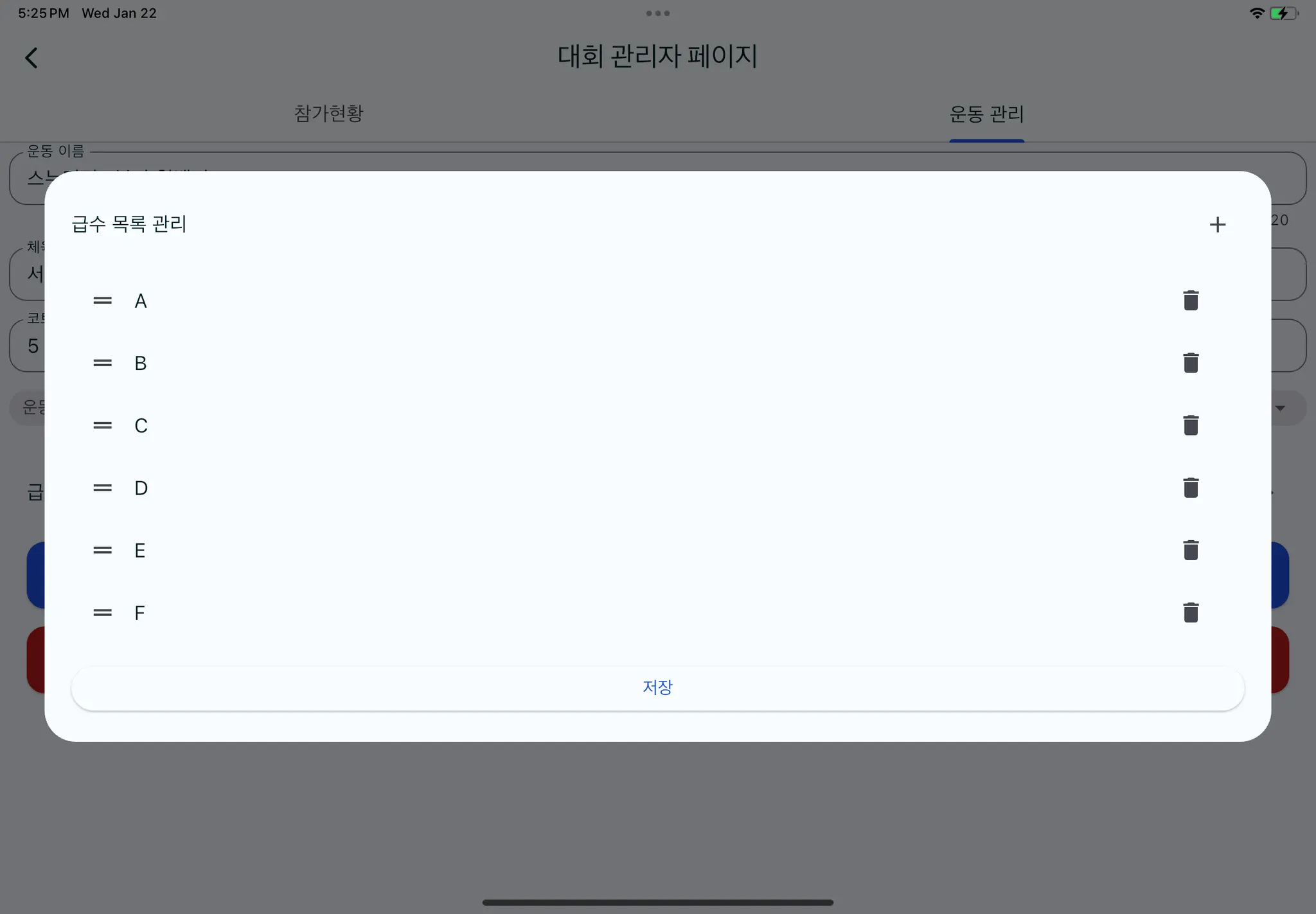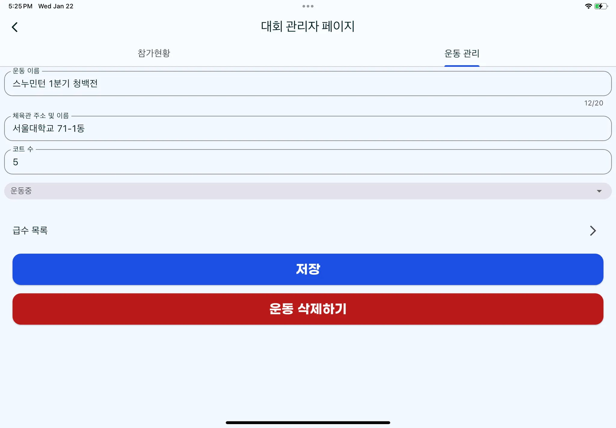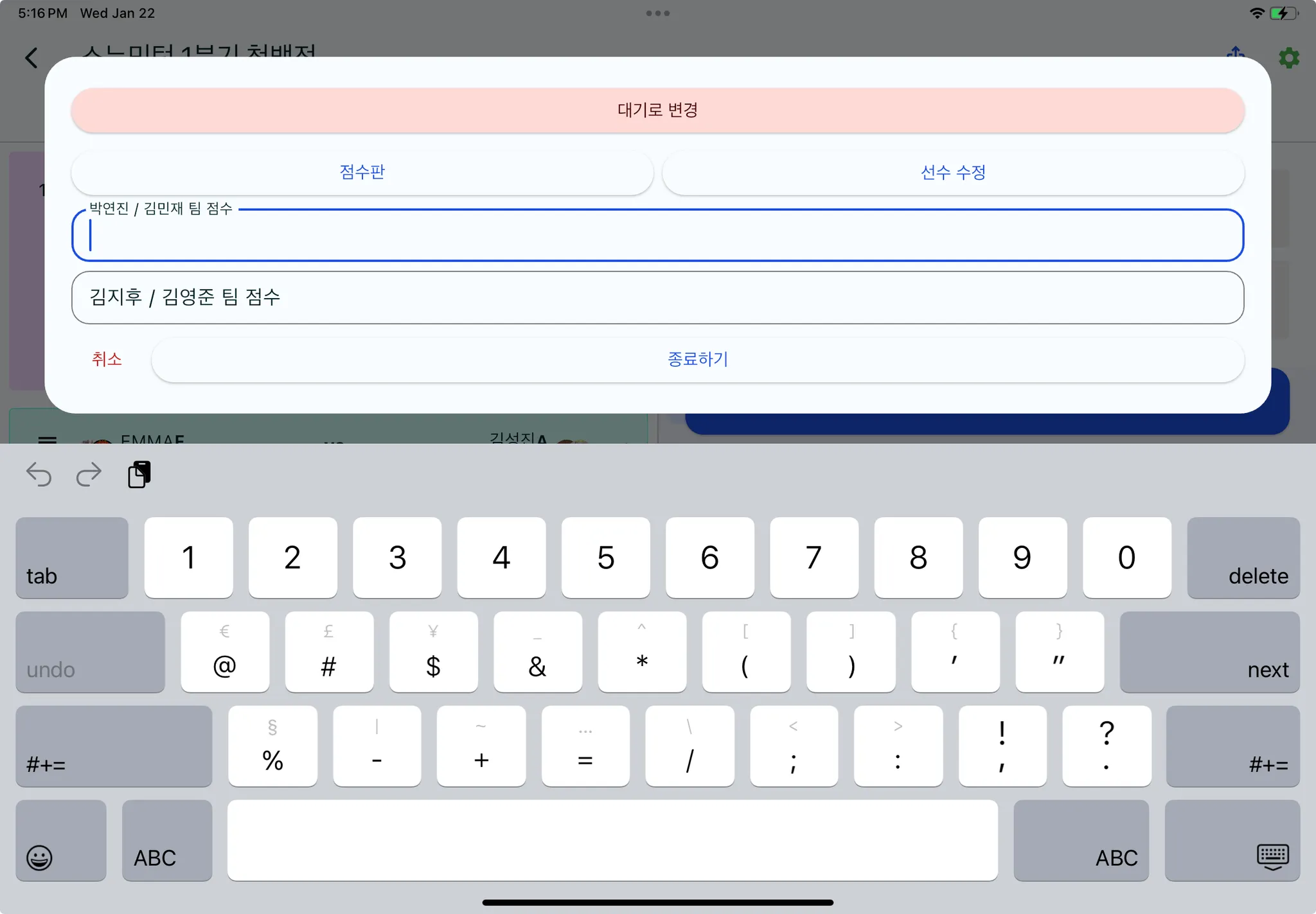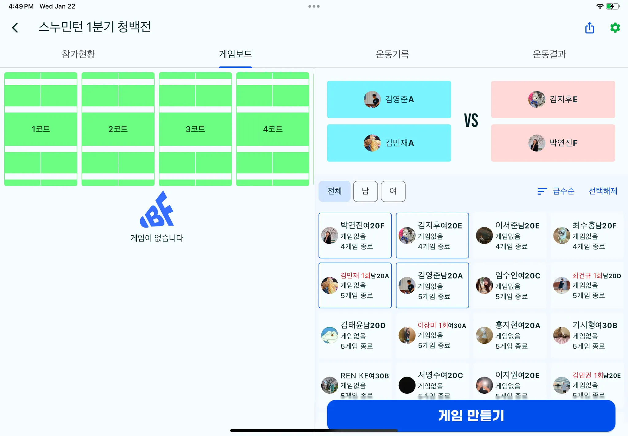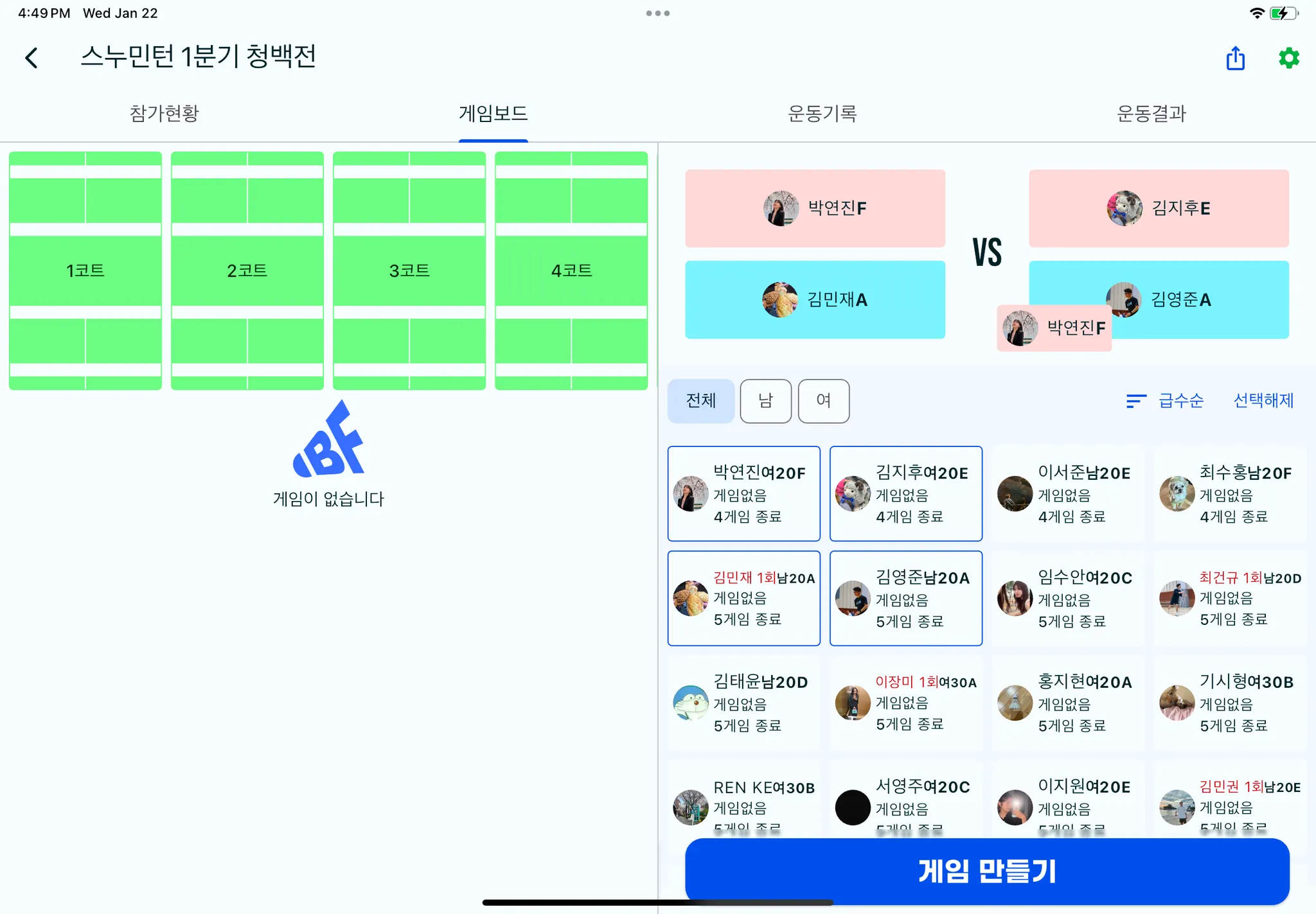대기 목록의 게임을 길게 누른 후 원하는 코트로 드래그하면 게임이 배정됩니다