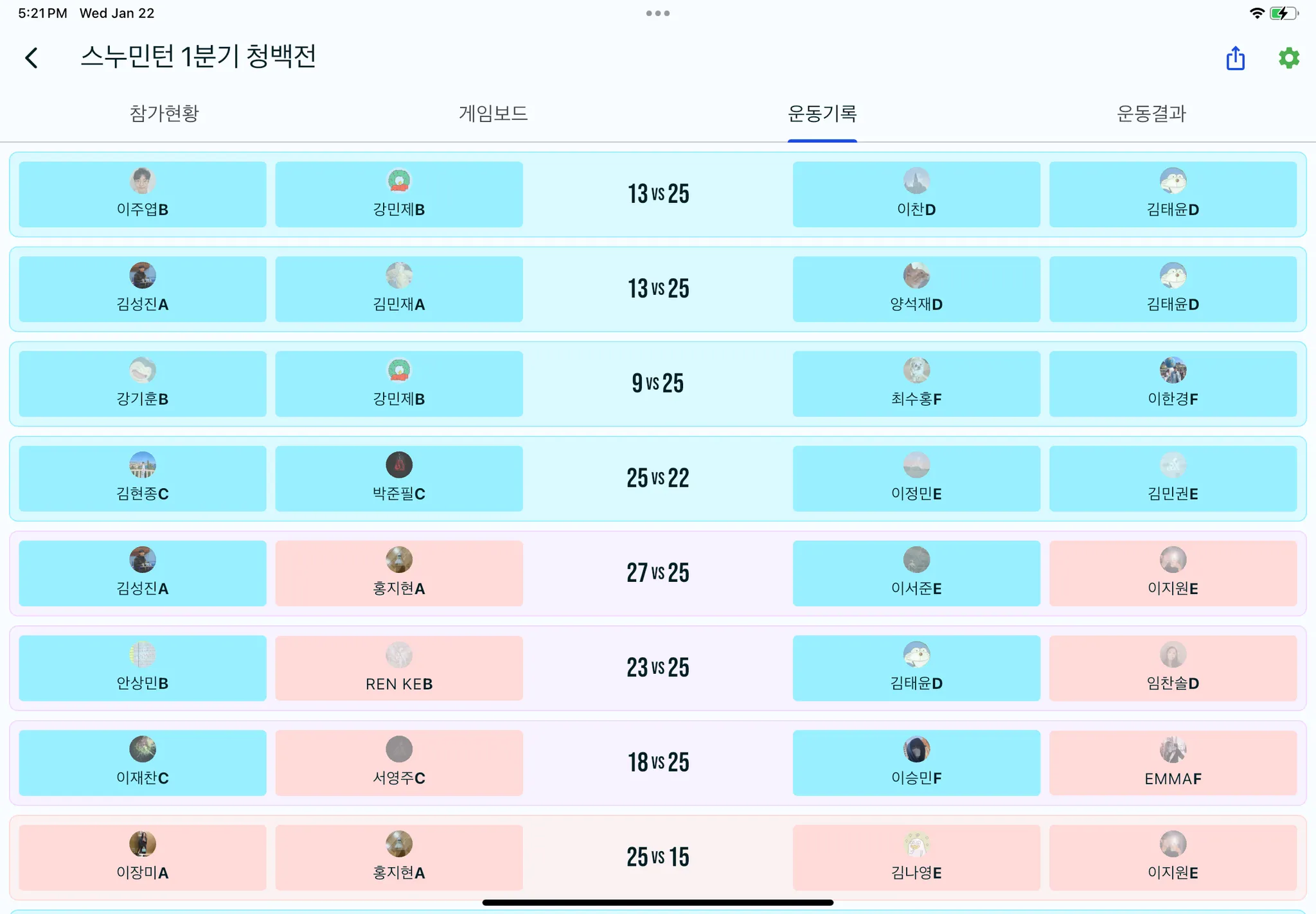 '운동 기록' 탭: 종료된 경기 목록 확인