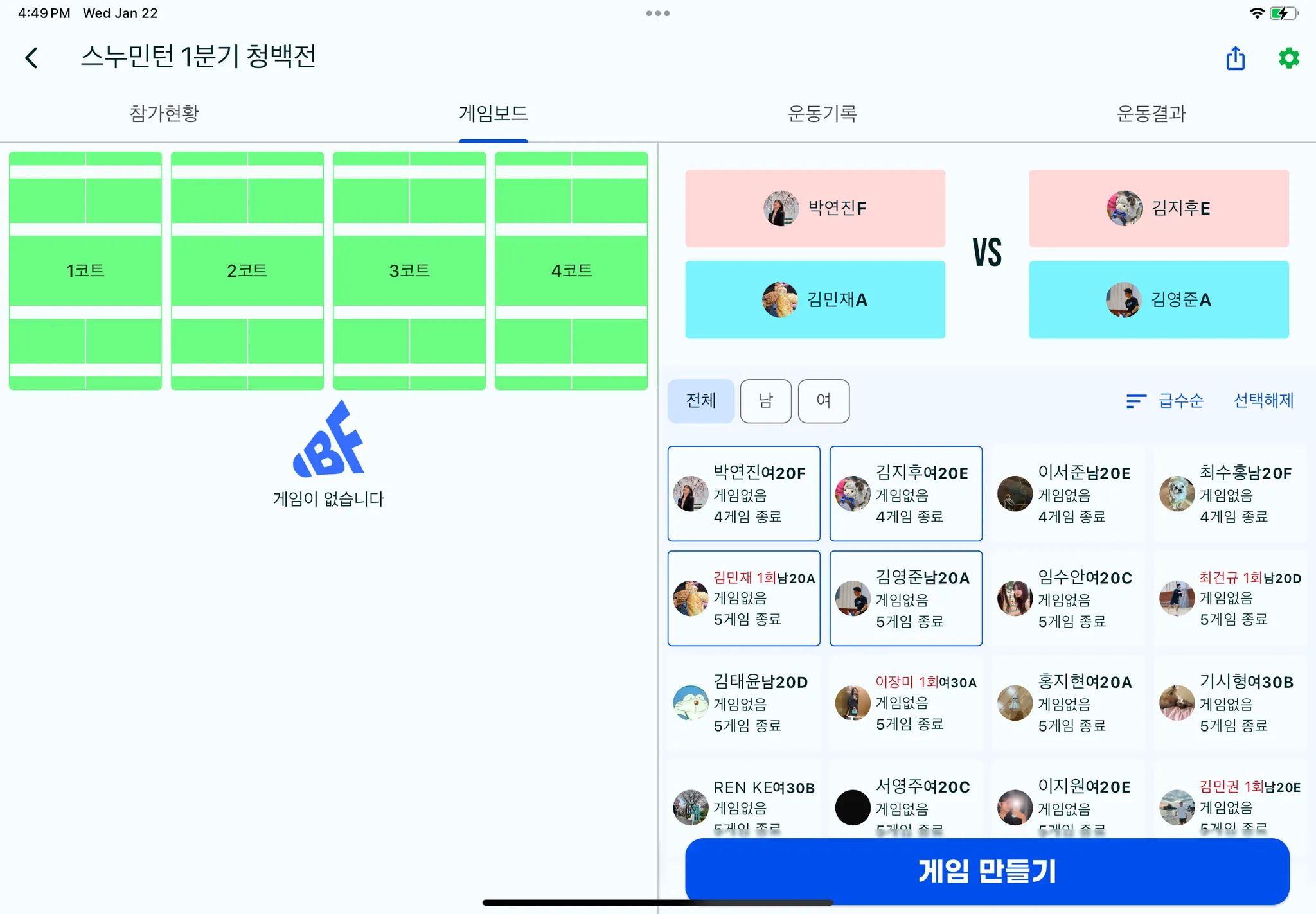 모든 선수를 선택한 후 하단의 게임 만들기 버튼을 누르면 게임이 생성됩니다