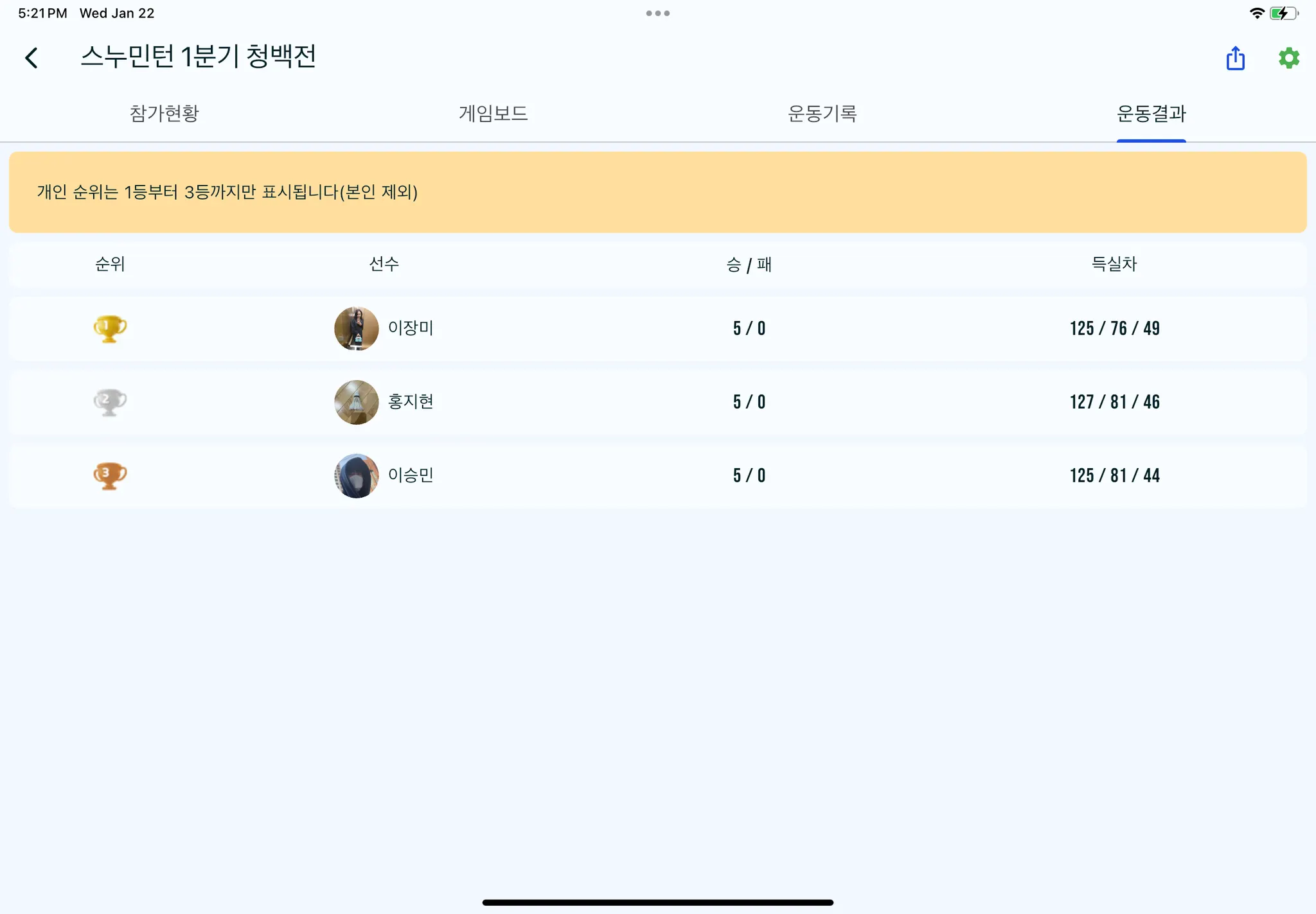 '운동 결과' 탭: 1,2,3등 및 개인 랭킹 확인