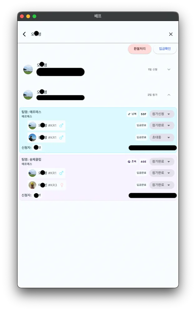 대회 관리자 페이지 > 참가관리 > 선수 이름 검색
