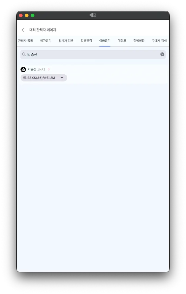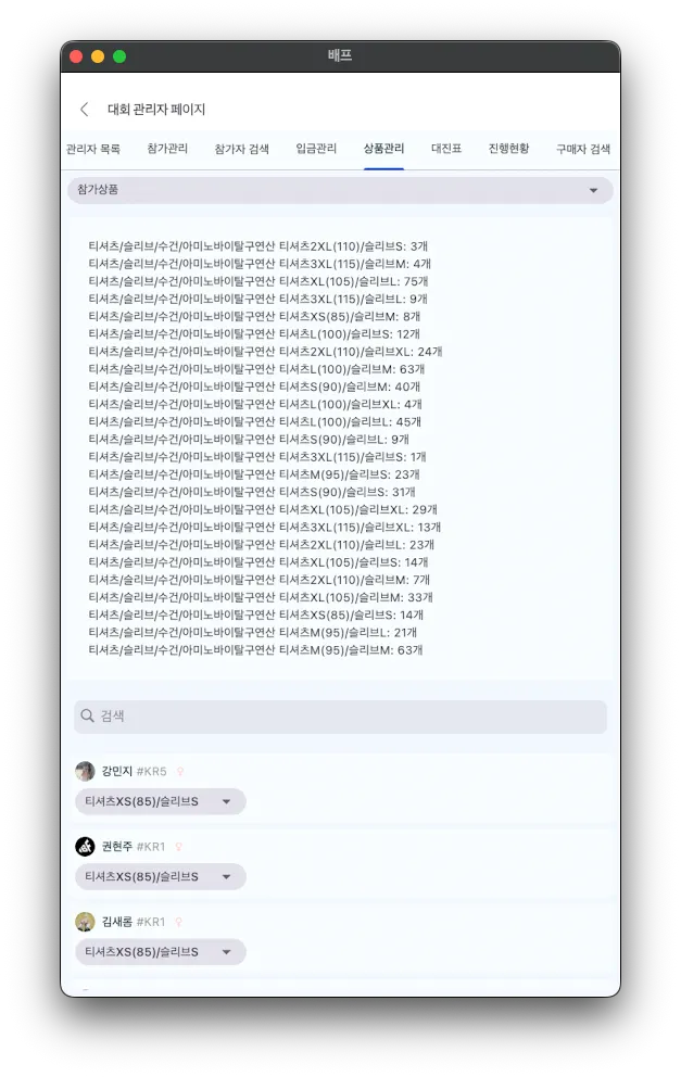 팀 및 개인의 상태를 참가완료로 전부 변경이 된 상태에서 대회 관리자 페이지 > 상품관리 > 참가상품으로 변경 후 해당 선수의 이름을 검색하면 해당 선수가 선택한 참가상품 사이즈가 나옵니다.