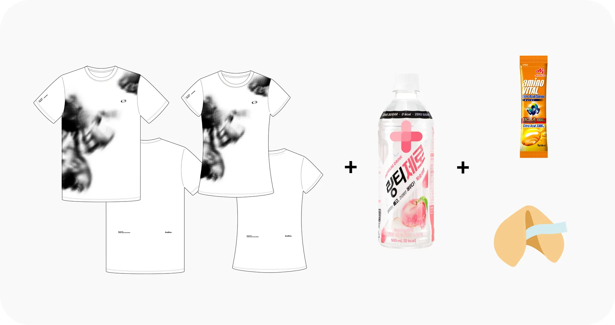 1종목 출전 시 | 엔드라인 경기복 티셔츠 + 아미노바이탈 1포 + 링티제로 복숭아맛 1병 + 포춘쿠키 1개 |