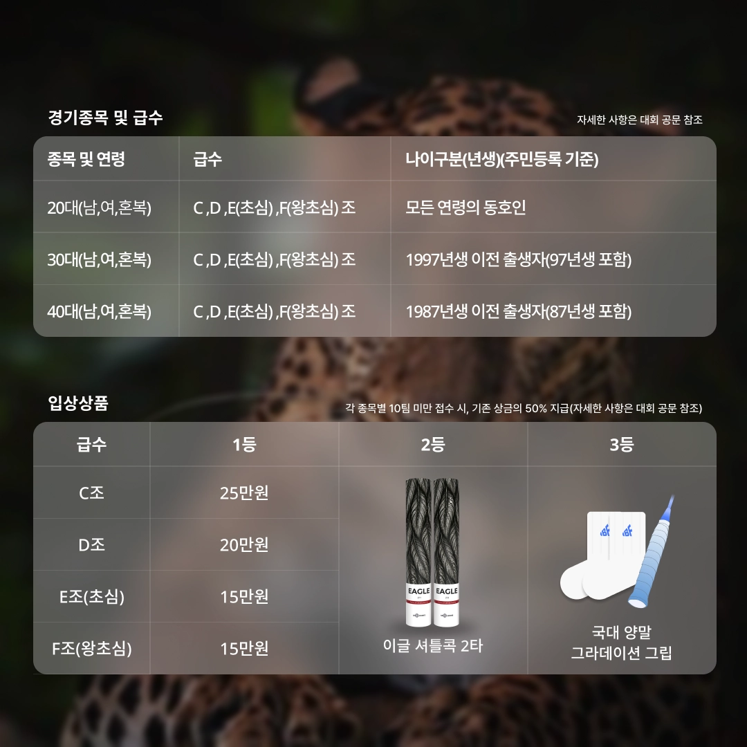 20대(남복,여복,혼복) | C조,D조,E조(초심),F조(왕초심) | 모든 연령의 동호인 |
