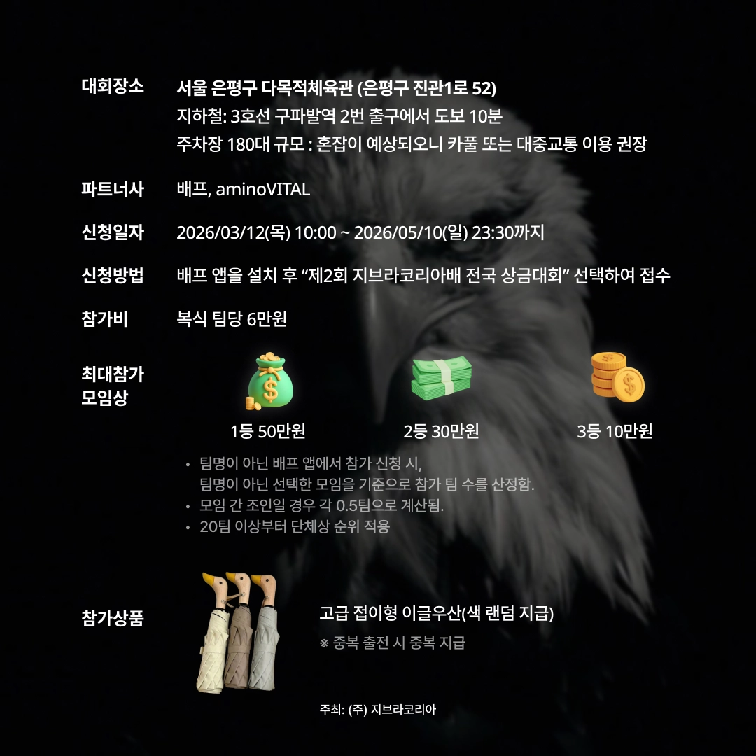 배프 앱을 설치 후 “제2회 지브라코리아배 전국 상금대회” 선택하여 접수