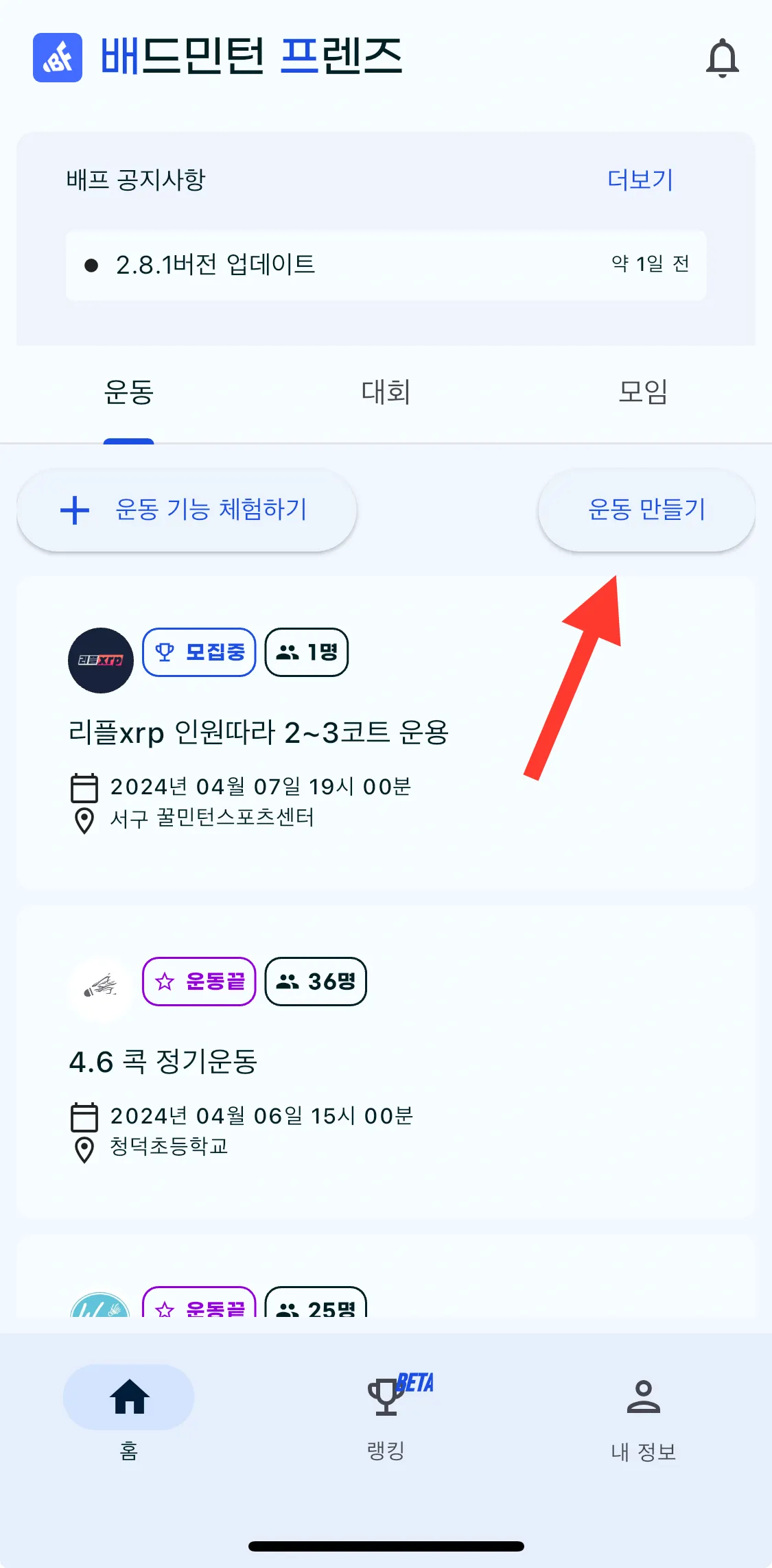 운동 만들기 버튼이 운동 탭 하위로 이동했어요.